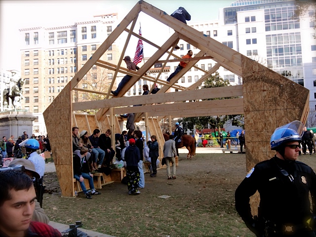 During a nine-hour standoff with U.S. Park Police in December 2011 over the so-called “Occubarn,” a wooden shelter that officials demanded protesters dismantle, 31 people were arrested. Twelve were ultimately charged with failure to obey a crowd and traffic clearing order. One protester, David Givens, was also charged with indecent exposure and disorderly conduct for urinating from the structure.