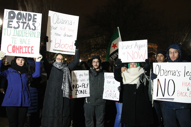 The group swelled to around 500 people as they marched to the Russian ambassador’s house where activists gave impassioned pleas for Vladimir Putin to stop supporting sitting Syrian president Bashar al-Assad, whose regime has been responsible for brutal civilian killings. (The Russian embassy is located far from the White House and would have made for a difficult march in the frigid temperatures.) Protesters chanted “free free Syria” and “free free Aleppo” as they wove through the city, sometimes blocking traffic, before looping back to the White House where they ended the vigil.