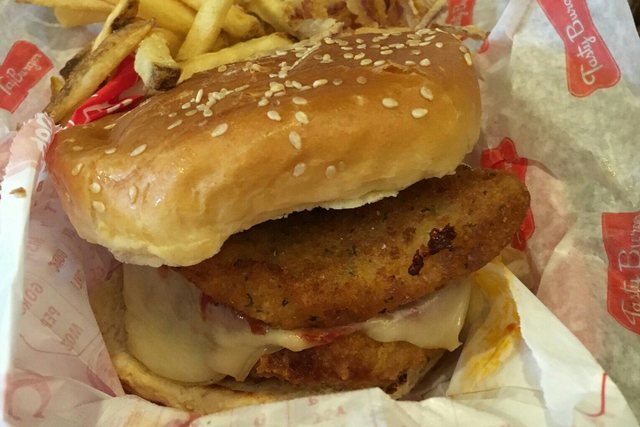The Chicky Chicky Parm Parm at Tasty Burger wondrously places a fried disc of mozzarella cheese a top its fried chicken cutlet. (Photo by Josh Novikoff)
