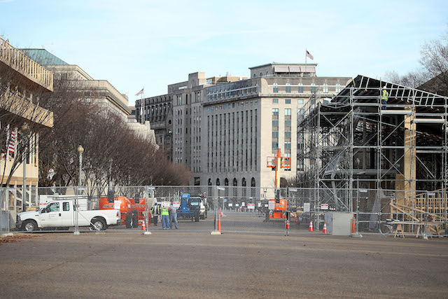 Workers build the inaugural parade reviewing stands in front of the White House in December. (Photo by Mark Wilson/Getty Images)