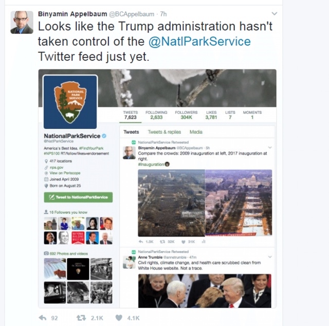 The Department of the Interior received an order Friday to cease activity on its Twitter accounts after two heroic National Parks Service employees retweeted two disparaging message about the Trump Administration, including an unflattering side-by-side photo comparison of the National Mall during Obama’s 2008 inauguration and Trump’s inauguration. [Update: The NPS has apologized, more below]