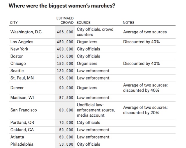 The largest march was probably on the Capitol Mall in Washington, which was estimated at 500,000 by local officials and at 470,000 by crowd scientists contacted by The New York Times. (By a variety of metrics, attendance at the Women’s March on Saturday exceeded that at Trump’s inauguration on Friday.) But there’s some ambiguity about this. In Los Angeles, organizers claimed to turn out 750,000 people, while police and public officials didn’t put out a precise estimate. Using our 40 percent discount rate yields an estimate of 450,000 people. In New York, meanwhile, the Mayor’s Office estimated the crowd size at 400,000, while organizers put the number at 600,000. (We used the Mayor’s Office estimate.) It’s possible that any of Washington, New York and Los Angeles actually had the largest march.