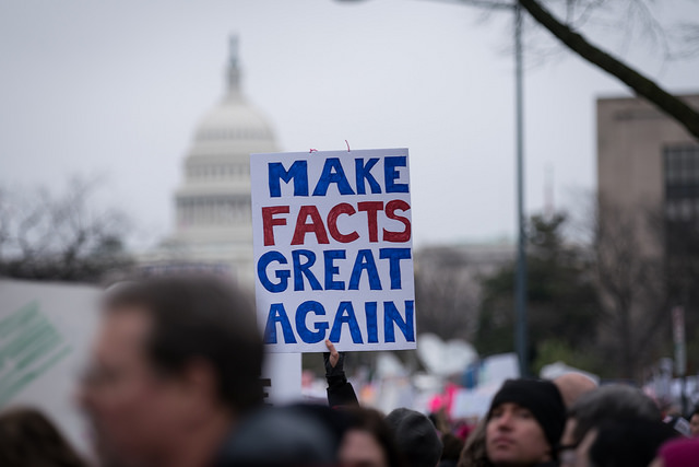 Woman on janitorial staff comes in to start cleaning the restroom and is talking on her phone: “I’ve been telling alternative facts my whole life. I’m about to go tell one right now so I can go home.”