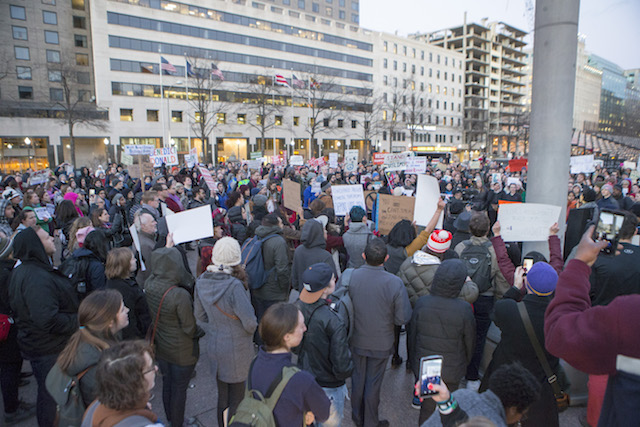Like every day since the inauguration of Donald Trump, a large group of people came together to protest the new president’s policies on Thursday evening.