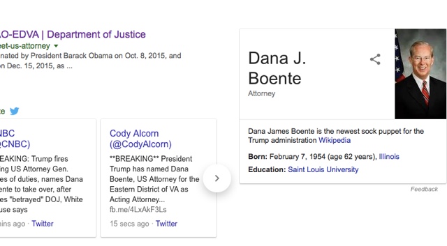 The new acting Attorney General is Dana Boente, whose Wikipedia entry was briefly edited: