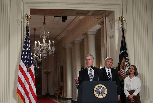 Judge Neil Gorsuch (L) speaks to the crowd as his wife Louise (R) looks on after U.S. President Donald Trump (2nd L) nominated him to the Supreme Court during a ceremony in the East Room of the White House January 31, 2017 (Getty Images)