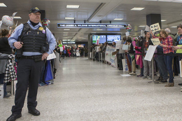 Around the same time as her ruling, over 100 people kneeled for an hour in protest of the ban in the concrete parking lot outside JFK’s Terminal 4.