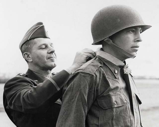 Lt. Earnest Childers (right) a member of the Muscogee (Creek) Nation, received the Conrgessional Medal of Honor in 1944. In September 1943, near Oliveto, Italy, he wiped out two German machine gun nests, killed enemy snipers and captured an artillery observer. (National Museum of the American Indian)
