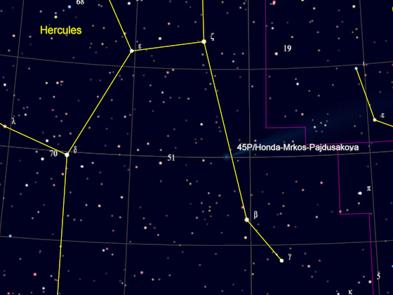 Then, Comet 45P/Honda-Mrkos-Pajdusakova is expected to “zoom past Earth at 51,000 mph”—making its closest pass around 3 a.m. tomorrow morning, according to Sky & Telescope Magazine. Skygazers who use binoculars or small telescopes should be able to catch the comet’s fly-by.
