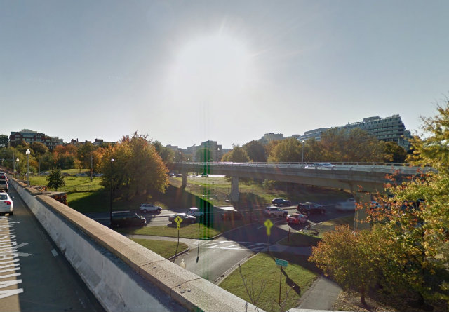 Homeless encampments have repeatedly been erected underneath the Whitehurst Freeway, near K Street NW. (Via Google Streetview)