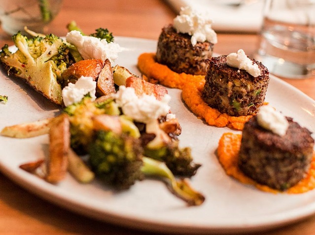 The batter is then formed into shape within ring molds and crisped up using a non-stick pan to keep the dish as healthy as possible by minimizing added oil. The cakes get topped with a seasonal pureé that changes with what’s fresh, and they’re always finished with dabs of locally sourced, aged goat cheese. The hearty entrée-sized portion runs $22, and you can score a discount on Monday when all meatless entrees and sides are 30 percent off.