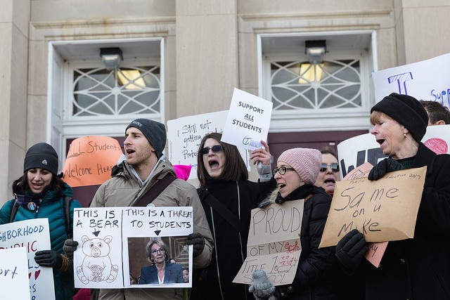 DeVos, who has never attended or sent her children to public school, began her tenure by visiting Jefferson Academy in Southwest D.C. She was met with hundreds of protesters, one of whom temporarily blocked her entrance into the school.