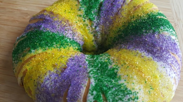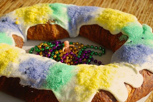 Bayou Bakery’s King Cake will be served at Dock 5’s Mardi Gras bash this Tuesday, along with plenty of beads. (Photo by Bayou Bakery).