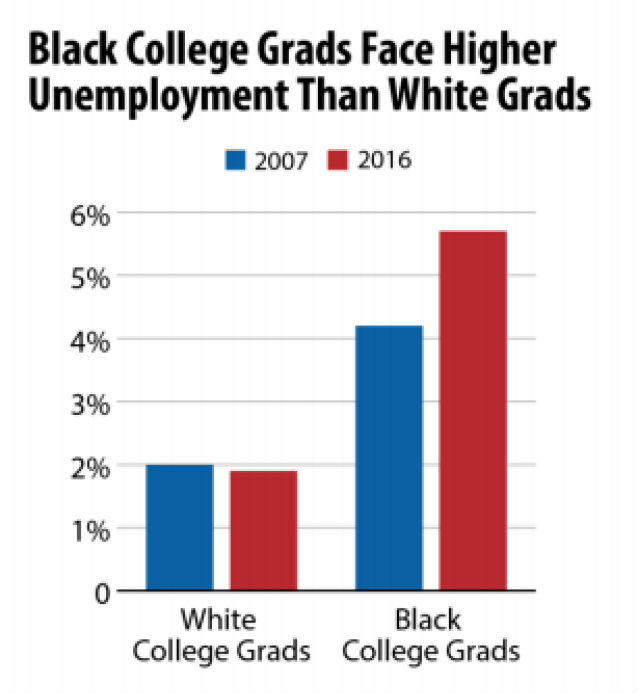 Non-black college graduates have an unemployment rate of 1.9 percent; for black college graduates it is 5.7 percent. Sufficient data was unavailable to compare those rates for those with post-graduate degrees, according to Lassiter.