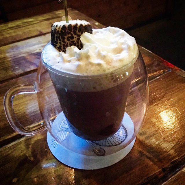 A mezcal + green chartreuse-spiked, toasted marshmallow-topped hot chocolate at Jack Rose Dining Saloon. The restaurant is offering $8 hot cocktails and comfort foods by the fire on Tuesday and Wednesday. (Photo via Facebook)