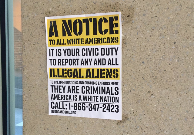 One of the posters read: “A notice to all White Americans: it is your civic duty to report any and all illegal aliens to U.S. Immigration and Customs Enforcement. They are criminals. America is a white nation.”