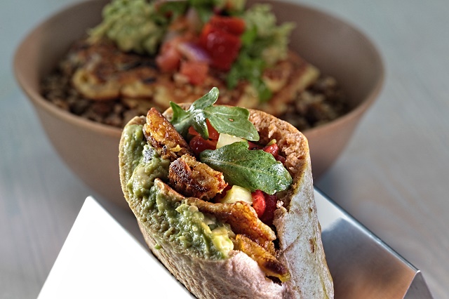 Shouk’s new breakfast pita mimics an omelet without any animal products. (Photo by Len DePas)