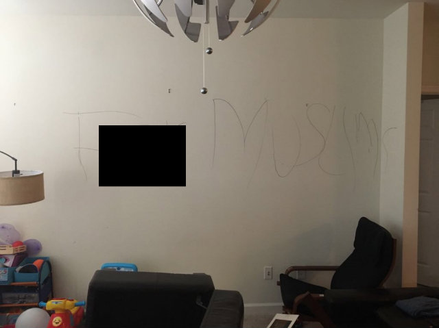 A family returned home from a trip to New York to find their apartment ransacked and messages of hate scrawled on the wall. (Photo courtesy of CAIR)