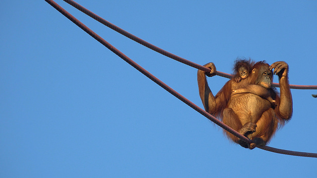 Now, at 7-months, he’s crossing yet another barrier: taking his first trip on the Orangutan Transport System, the 50-foot-high suspended cable that allows orangutans to travel between the Great Ape House and Think Tank exhibits. As Erin Stromberg, a primate keeper at the zoo, explained it, the O-Line allows the primates to “choose where to spend the night and who to spend the night with.” It was constructed in 1995, so Redd is the first infant to ever cross it.