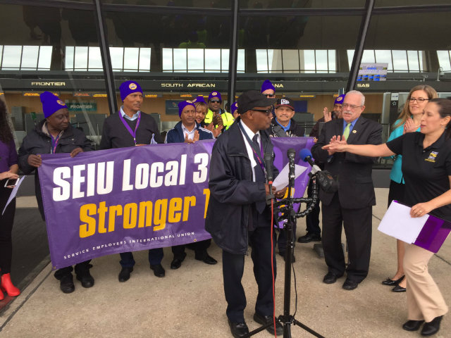 David Tucker speaks at a press conference celebrating passage of a living wage for contracted service workers at Dulles and National Airports. (Photo courtesy of 32BJ SEIU)
