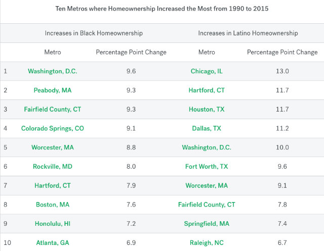 The only other two areas that were in the top 10 for increases in both black and Latino homeownership were Fairfield County, Connecticut and Worcester, Massachusetts.
