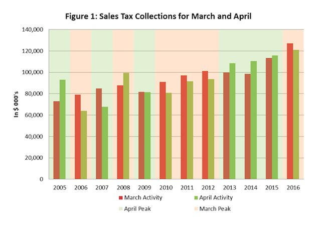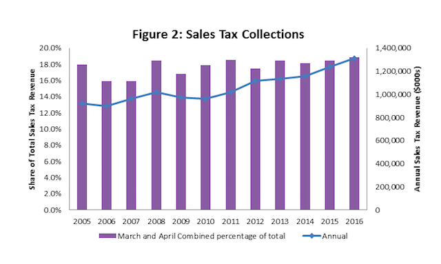 In the past dozen years, the month during which peak bloom occurred had higher sales tax collections 10 times, as you can see here: