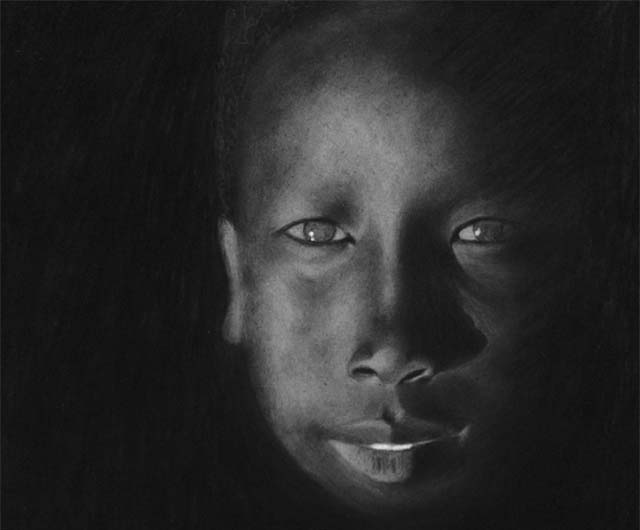 Even though the children were reluctant to talk, the exhibit shines its primary spotlight on them, with striking images drawn to look like they were produced in a darkroom. Salvo had help from a professional photographer friend, who inspired the aesthetic technique of adapting iPhone photos using charcoal, and from her high school art teacher, who lent exhibit space for the project’s initial run.