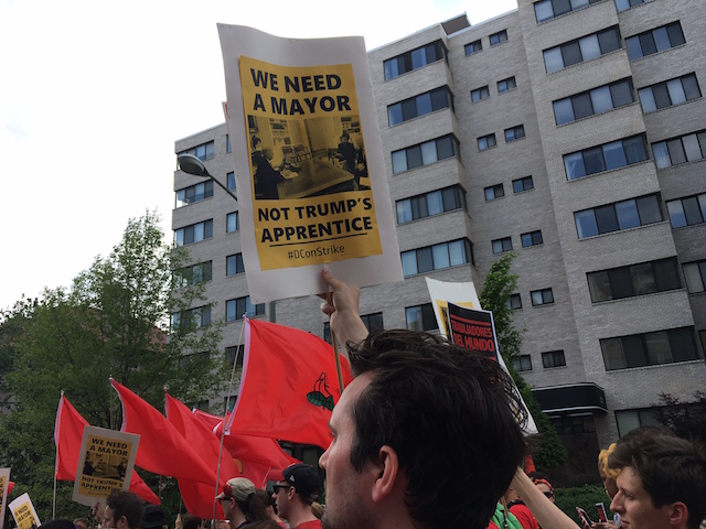 One of the most popular signs at this year’s May Day march featured a photo of Mayor Muriel Bowser and President Donald Trump, with the text, “We need a mayor, not Trump’s apprentice.”