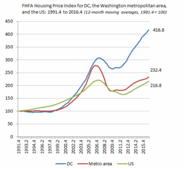 The graph is based on figures from a quarterly index compiled by the Federal Housing Finance Agency, which reflects how the same properties change value over time based on sales and refinancing data. Over the 25-year period, home values in D.C. grew twice as much as both the Washington metropolitan region as a whole and the country’s average.
