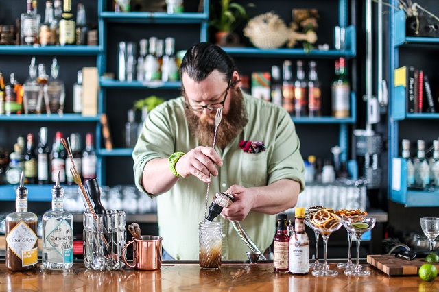 Lukas B. Smith behind the bar at Cotton & Reed. (Photo by Farrah Skeiky)