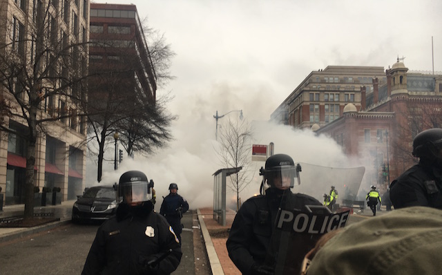 On January 20, police and protesters clashed downtown (and, to a much lesser degree, by the National Mall) throughout the day. Smashed windows and a limousine set ablaze, among other incidents, resulted in more than $100,000 in damages to buildings, property, and vehicles, and minor injuries to six officers, according to the U.S. Attorney’s Office for D.C.