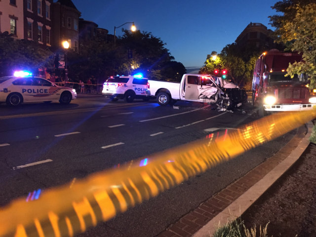 The driver of a white pick-up truck was traveling “at a high rate of speed” on 18th Street NW before striking two bike patrol officers and the Department of Public Works employee, according to D.C. Police Chief Peter Newsham. After hitting the officers, the vehicle traveled further down the street before hitting a truck and coming to rest in the 1800 block of Adams Mill Road.