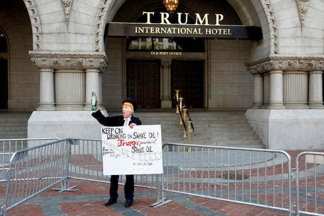 A protestor dressed as President Donald Trump stands outside the Trump International Hotel April 15, 2017 in Washington, DC. Activists gathered in cities nationwide to demand President Donald Trump release his tax returns. (Photo by Aaron P. Bernstein/Getty Images)