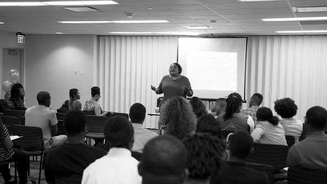 D.C. Deputy Mayor Courtney Snowden speaks to a group of youths. (Photo via DCRA)