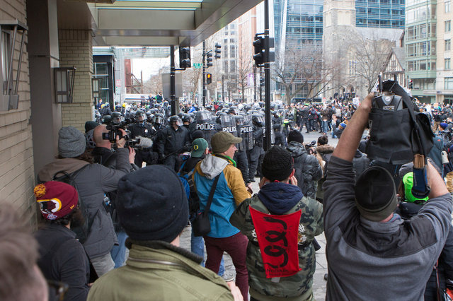 Riot police and protesters on Inauguration Day. (Photo by Alex Edelman)