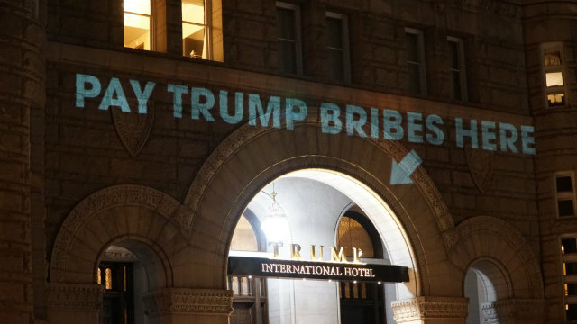 Artist Robin Bell projected the clause, along with “Pay Trump bribes here” and “Emoluments welcome,” on the hotel’s entrance of the hotel in May.