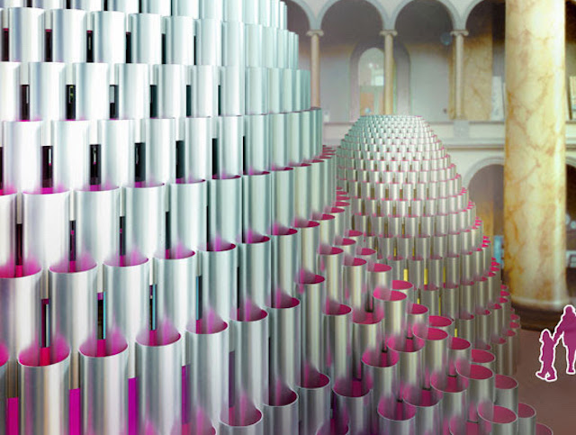 After blockbuster installations dedicated to icebergs and the beach, the National Building Museum turns to a perhaps less comforting structure for this summer’s immersive show: the honeycomb. Hive consists of three interconnected, domed chambers made out of thousands of paper tubes painted silver and magenta. The installation was designed by Studio Gang, whose founder Jeanne Gang describes it as, “ a series of chambers shaped by sound that are ideally suited for intimate conversations and gatherings as well as performances and acoustic experimentation. Using wound paper tubes, a common building material with unique sonic properties, and interlocking them to form a catenary dome, we create a hive for these activities, bringing people together to explore and engage the senses.”