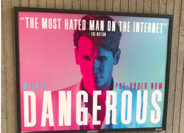 The advertisement for Yiannopoulos’s self-published new book, Dangerous, showed his face in technicolor with the words “The Most Hated Man On The Internet.”