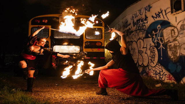 You know a show is going to be interesting when a crew member is stationed strategically to “watch for body fires.” Performed at Old City Farm & Guild, a garden center with a mini amphitheater next to the skate park in Shaw, 8 Bit Circus Sh*t is pornography for pyromaniacs. Both acts are inspired by video games, the first a (literally) fired-up version of fighting games like Mortal Kombat, the second an homage to the 1999 Japanese horror game Silent Hill. The first act plays almost like a real-life video game, with audience applause determining which fighters face off. Each has a storied past described by the video console “Controller” Geoffrey Baskir, whose delivery could use a little more pep. But the fights themselves are a rush of adrenaline. Satori (Sam Stevens) is like an Edward Scissorshands of fire, Madam Ethereal (Dani Swidrack) swings a giant bat of flame, and Happy (Cole Turpie) rips away his Joker-like mask to better spin his fire stick. The fights are characterized by near-misses—some seem choreographed, others genuinely cringe-worthy—and implausible comebacks.