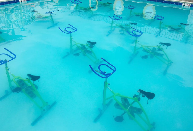 4:52 p.m.: I suck it up and check into the class. A series of bikes are submerged in the pool in rows, and a group of older women are securing their visors and one-piece suits before getting in. The workout music is cranked up, and I can’t help but feel like I’m about to take a water aerobics class.