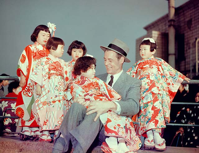 Bad guy Robert Ryan cuddles up in occupied Japan (Twentieth Century Fox Film Corp./Photofest)