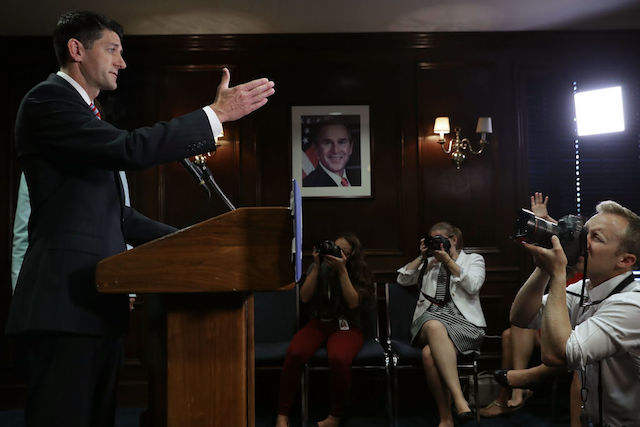 Speaker of the House Paul Ryan (R-WI) calls on reporters during a news conference at the Republican National Committee headquarters on Capitol Hill. (Photo by Chip Somodevilla/Getty Images)