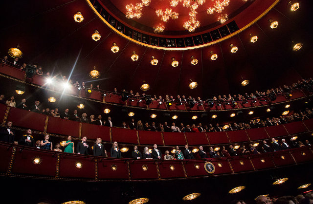 President Barack Obama, first lady Michelle Obama ,and the honorees listen to the National Anthem during the Kennedy Center Honors show on December 4, 2016. The honorees include the band The Eagles, singer Mavis Staples, actor Al Pacino, singer James Taylor and pianist Martha Argerich. (Photo by Aude Guerrucci/Getty Images)
