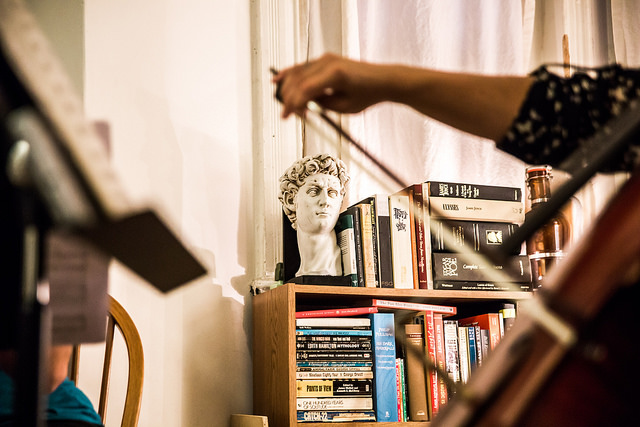 It certainly didn’t seem to be any of those things inside a narrow row house in Georgetown on a recent Friday night in July. In a dimly basement with exposed piping, shelves of old books, and a smattering of somewhat dusty antiques, two Julliard-trained professional musicians were playing Brahms’ Sonata No 1, Opus 78 in G major for a rapt audience. Space was limited, and people who had only met thirty minutes prior were squished knee-to-knee on couches, the ground, or whatever surface they could perch themselves on comfortably (or not). Ages ranged from 17 to 70, but averaged in the mid- to late-twenties. Some tapped their feet, others closed their eyes. Nobody was on their phone—well, aside from lifting it up to take a quick photo or to send a Snapchat.