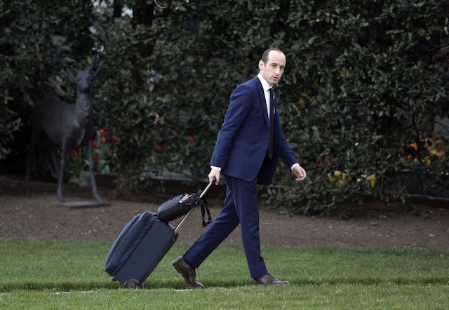 Stephen Miller, senior policy advisor to U.S. President Donald Trump walks on the South Lawn upon arrival at the White House in April 9, 2017 in Washington, DC. (Photo by Olivier Douliery-Pool/Getty Images)