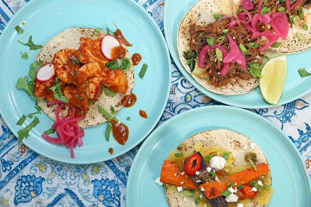 The opening menu includes a slow braised pork taco with Chinese five spice and tamarind; a vegetable taco with roasted carrots, butternut squash, and goat cheese; a shrimp taco with Korean tomato stew; and beef al pastor with pineapple soy. All of it is gluten-free. A weekly special will also be available.