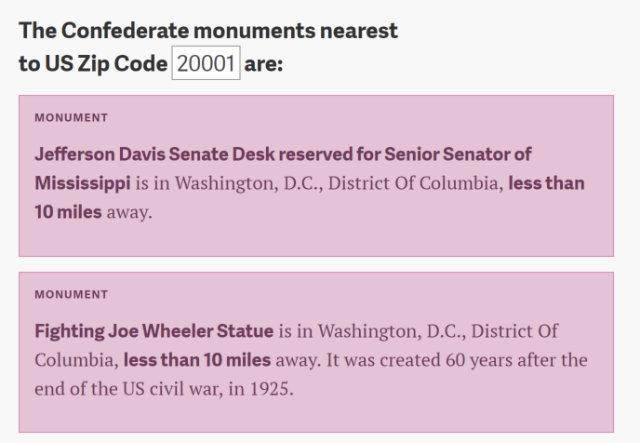 Quartz has put together a tool to search by zip code for the closest monuments, streets, and buildings that honor Confederate generals.