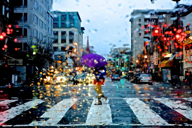 Night on V Street NW between 11th and 12th, in front of Tacos El Chilango: