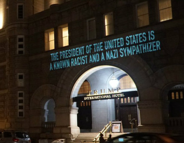 So that’s what he and a team projected onto the Trump International Hotel: “The president of the United States is a known racist and a Nazi sympathizer.” It continues: “This is not a drill.”