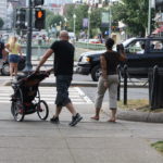 A 30-something couple walking down the street in Woodley Park: